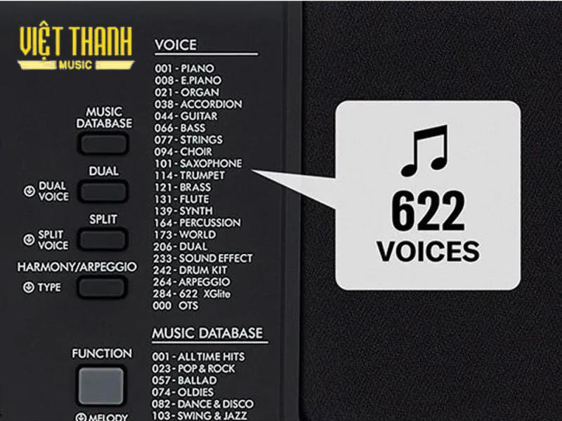 Tất cả cùng nhau tạo nên một thư viện âm thanh nhạc cụ toàn diện. Bạn thậm chí có thể xếp hai Tiếng nhạc khác nhau trên toàn bộ bàn phím dưới dạng “Tiếng nhạc kép – Dual Voice” giúp cho phần trình diễn của bạn phong phú hơn!