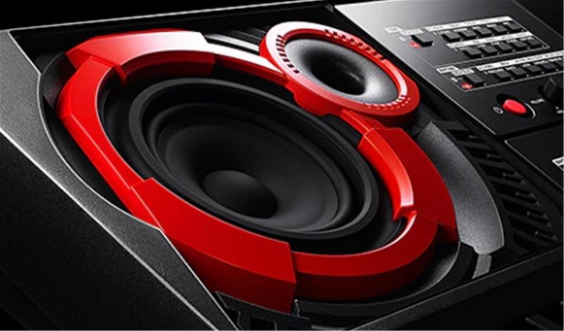 Hệ thống âm thanh bên ngoài cho loa phản xạ âm trầm hiệu suất cao được trang bị nam châm lớn và đặc biệt là thùng loa phản xạ âm trầm với thiết kế mới nhấn mạnh vào khoảng tần số thấp.