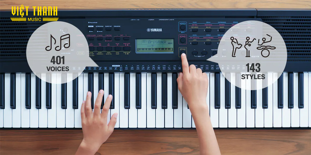 - 401 âm sắc chất lượng cao, kết hợp với 143 điệu nhạc đệm tự động