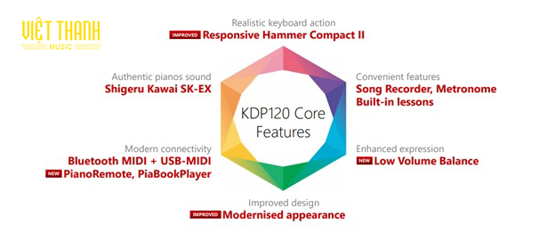 Bổ sung cho đàn piano điện KDP-120 đó chính là khả năng kết nối với ứng dụng PianoRemote, vật liệu giảm thiểu tiếng ồn bộ cơ, tăng cường độ biểu cảm với Cân Bằng Âm Lượng Trầm (Low Volume Balance), thiết kế diện mạo mới với nhiều lựa chọn màu sắc,… mà vẫn duy trì ở mức giá cạnh tranh. Đàn piano điện Kawai KDP-120 chính là lựa chọn hợp lý cho cả trẻ em và người lớn tuổi, người mới bắt đầu và cả những nghệ sĩ piano chuyện nghiệp.