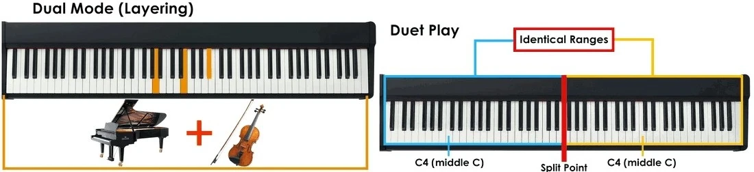 Chế độ Duo chia đôi bàn phím piano thành hai phần có cùng dải âm và cùng tông, cho phép hai người chơi cùng một lúc, mỗi người trên một nửa của bàn phím.