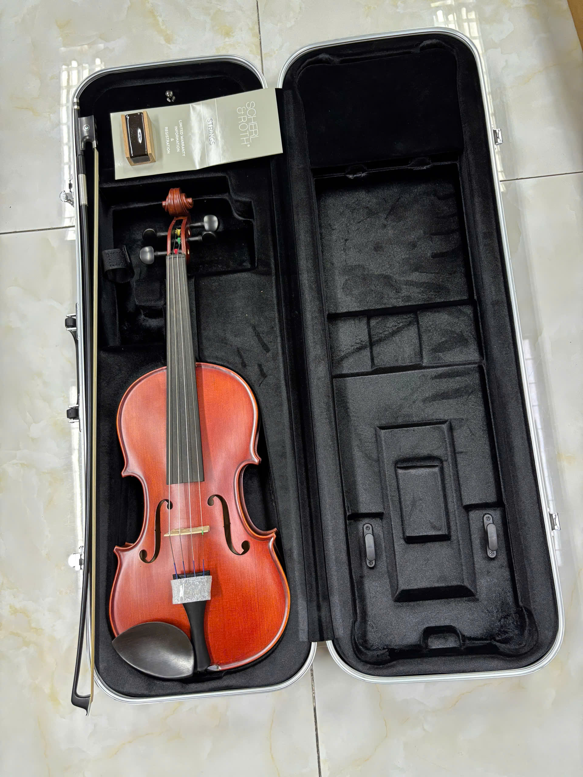 Đàn Violin Scherl & Roth SR41E4H đi kèm đầy đủ phụ kiện violin sẵn sàng chơi sau khi nhận đàn. Bao gồm Case cứng chính hãng hình chữ nhật, vĩ kéo-bow, rosin-nhựa thông, dây đeo hộp.