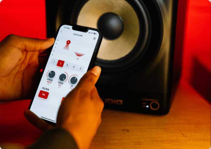 Ứng dụng của chúng tôi cho phép bạn điều chỉnh âm thanh theo ý muốn. Bạn có thể sử dụng các cài đặt sẵn và bộ cân bằng 5 dải (5-band EQ) để điều chỉnh âm thanh phù hợp với không gian phòng thu và sở thích cá nhân thông qua các chế độ nghe nhanh trên bảng điều khiển. Ngoài ra, nút điều chỉnh trim ở phía sau giúp bạn tinh chỉnh các cổng vào analog XLR và TRS, đảm bảo loa kiểm âm này tích hợp mượt mà vào bất kỳ thiết lập phòng thu nào.